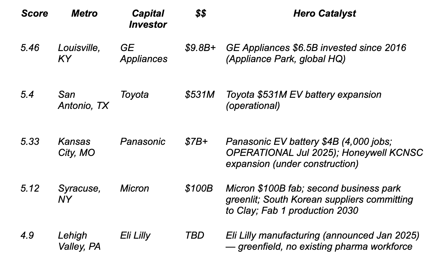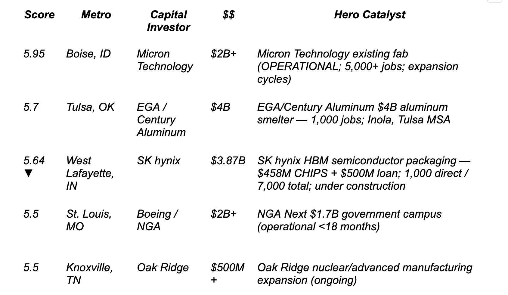 ▼ West Lafayette, IN — Drops from 7.1 to 5.64, the largest single-week move on the board. Falls from near the top of NEXT to near the bottom. SK hynix construction continues but the Progress scoring reflects updated timing on workforce arrivals. Worth monitoring closely — if the hiring timeline firms up, this recovers quickly.