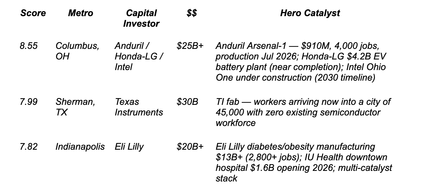 Scoring universe: 52 U.S. metros with qualifying catalyst activity as of Apr 26, 2026 Hero × Progress framework. Not investment advice.